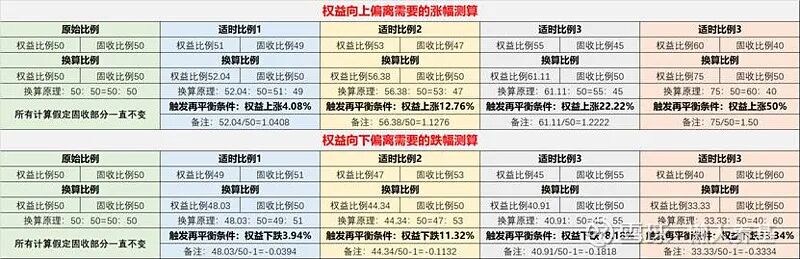 我在投资践诺中发现,通常百分点的偏离,股债平衡配置(也等于权利和固收齐是50%)需要的涨跌幅最小。